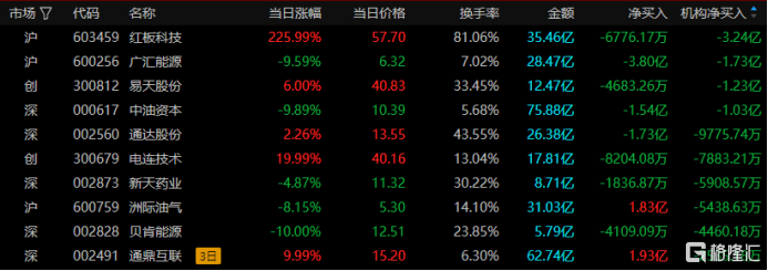 龙虎榜中涉及机构专用席位的个股中,当日净卖出额前三为红板科技、广汇能源、易天股份,分别为3.24亿元、1.73亿元、1.23亿元。