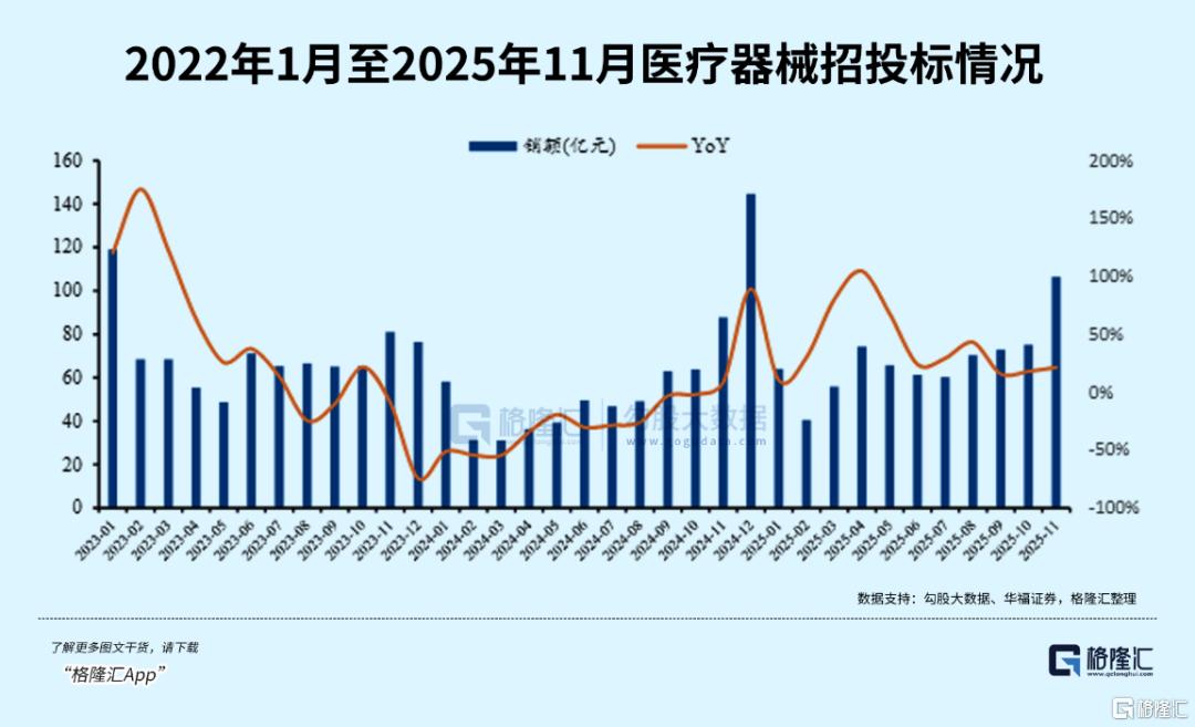 据众成数科数据,2025年第三季度国内医疗设备招投标明显回暖,7月至10月采购规模同比分别增长22%、31%、1%、14%。华福证券指出,医疗器械公司季度收入与招投标增速之间存在约3至4个季度的错位周期,预计2026年随着库存出清,报表端将迎来实质性复苏拐点。