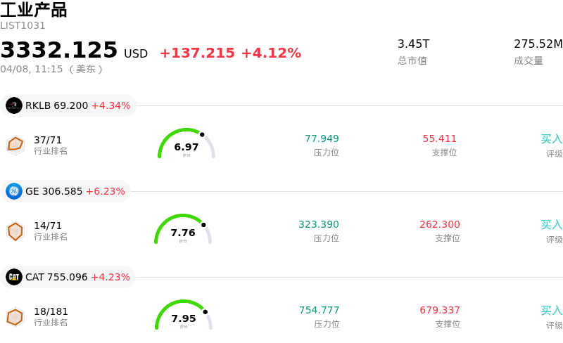 Caterpillar Inc (CAT) 盘中上涨4.23%, 所属行业工业产品上涨4.12% ,公司涨幅跑赢行业涨幅,行业成交额前三股票 Rocket Lab USA Inc (RKLB) 上涨 4.34%;GE航天航空 (GE) 上涨 6.23%;Caterpillar Inc (CAT) 上涨 4.23%。