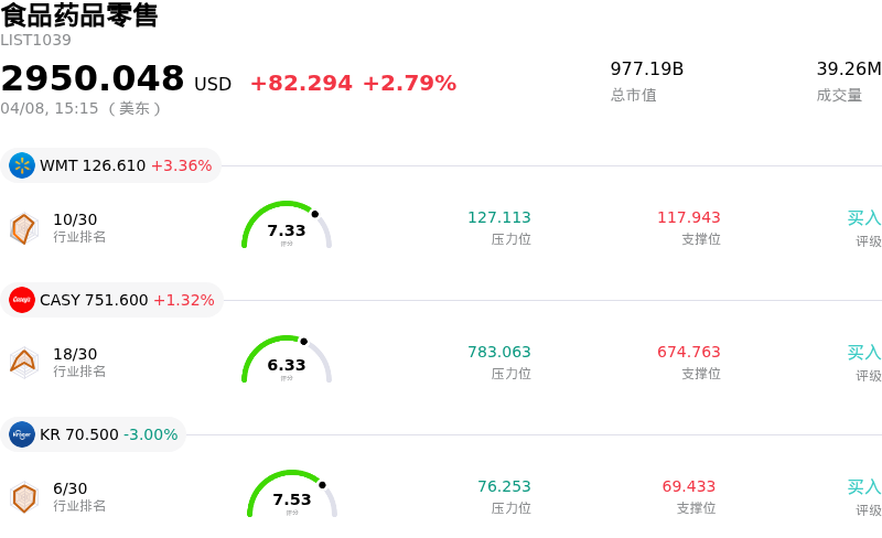 沃尔玛 (WMT) 盘中上涨3.36%, 所属行业食品药品零售上涨2.79% ,公司涨幅跑赢行业涨幅,行业成交额前三股票 沃尔玛 (WMT) 上涨 3.36%;Caseys General Stores Inc (CASY) 上涨 1.32%;克罗格 (KR) 下跌 3.00%。
