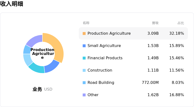 Deere & Co (DE) 处于工业产品行业,最新年度营业收入$45.67B,处于行业2,净利润$5.03B,处于行业2。「公司简介」