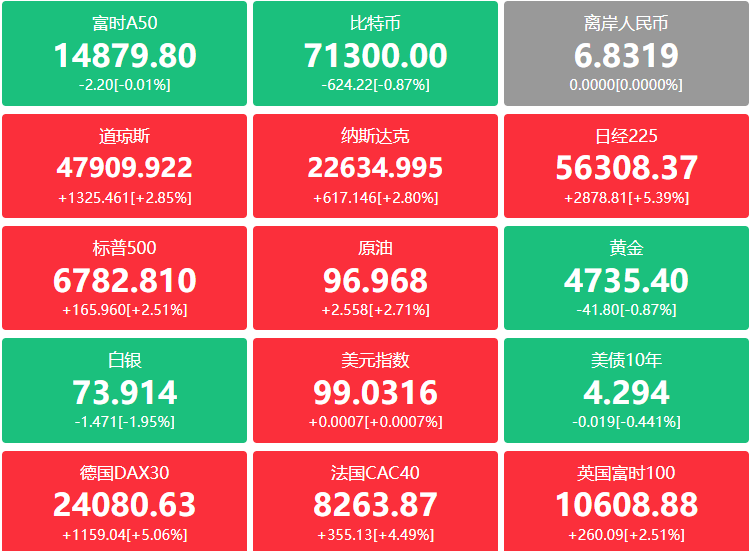 外盘:美伊停火引发市场乐观情绪,且交易员们开始考虑美联储年底前降息可能,美股全线收涨,其中道指涨1325.46点,涨幅2.85%报47909.92点;纳指涨617.15点,涨幅2.80%报22635.00点;标普500涨165.96点,涨幅2.51%报6782.81点,纳指、标普500录得六连涨;科技股集体上涨,英特尔涨超11%,闪迪涨超9%,西部数据涨超8%,美光科技涨超7%,Meta涨超6%,博通涨超4%,谷歌、亚马逊涨超3%;热门中概股收盘集体上涨,利弗莫尔中概股龙头指数涨1.35%,富途涨超11%,老虎证券涨超7%,哔哩哔哩涨超5%,阿里巴巴涨超4%,蔚来、小鹏集团涨超3%,百度、京东涨超2%。