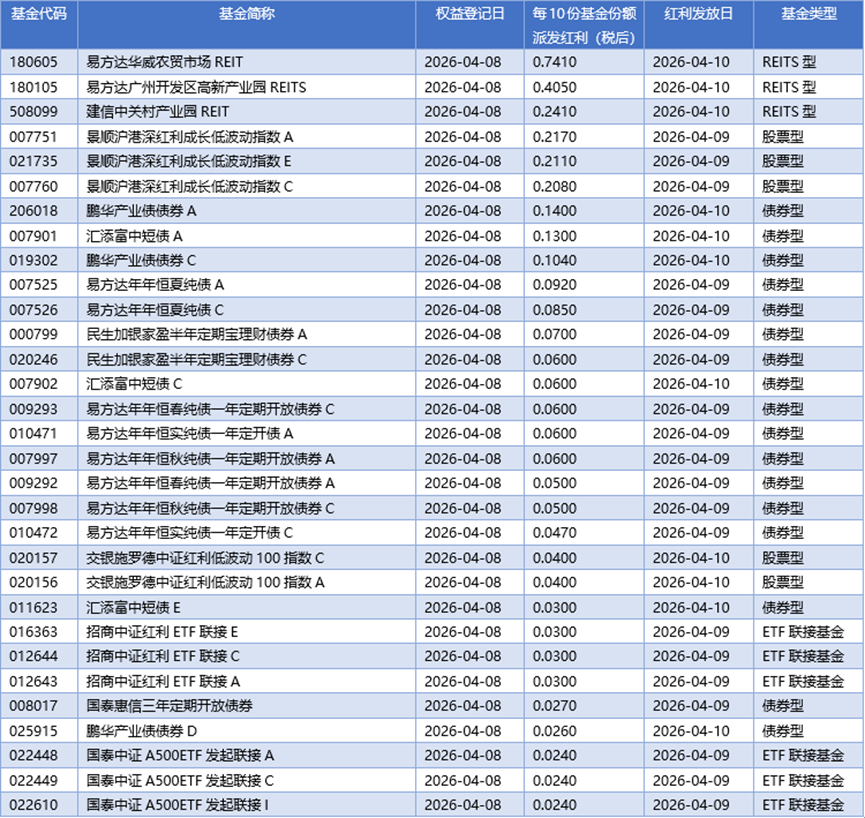 (1)04月08日新发基金共有14只,主要为股票型基金和债券型基金,其中英大产业精选混合A募集目标金额达60.00亿元;基金分红31只,多为债券型,派发红利最多的基金是易方达华威农贸市场封闭式基础设施证券投资基金,每10份基金份额派发红利0.7410元。