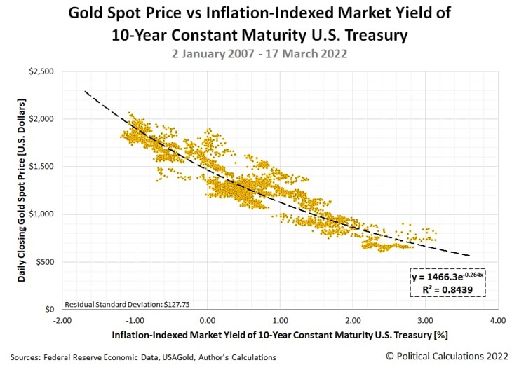 这张图把10年期通胀保值债(TIPS)的实际收益率,和黄金价格放在一起,你可以很清楚地看到两者的反向关系:实际利率往下走的阶段,黄金往往是往上走的。