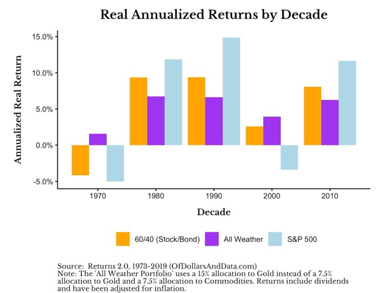 从几十年的历史数据来看,全天候组合的年化收益率通常低于纯股票组合,但在大的下行周期里损失显著更小。2008年标普500跌将近38%,而按照常见配置回测的全天候组合当年虽也录得负收益,但回撤普遍明显小于纯股票组合。