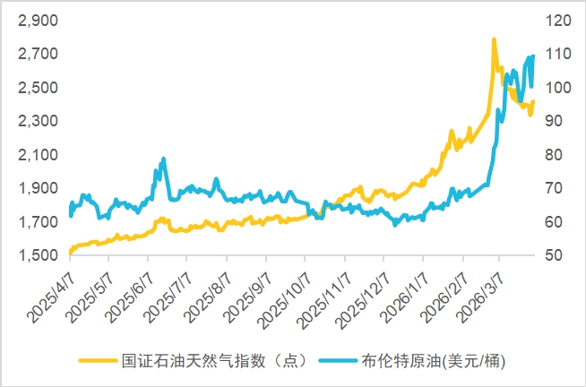 图: 国证石油天然气指数与布伦特原油期货价格走势对比(2025.04-2026.03)