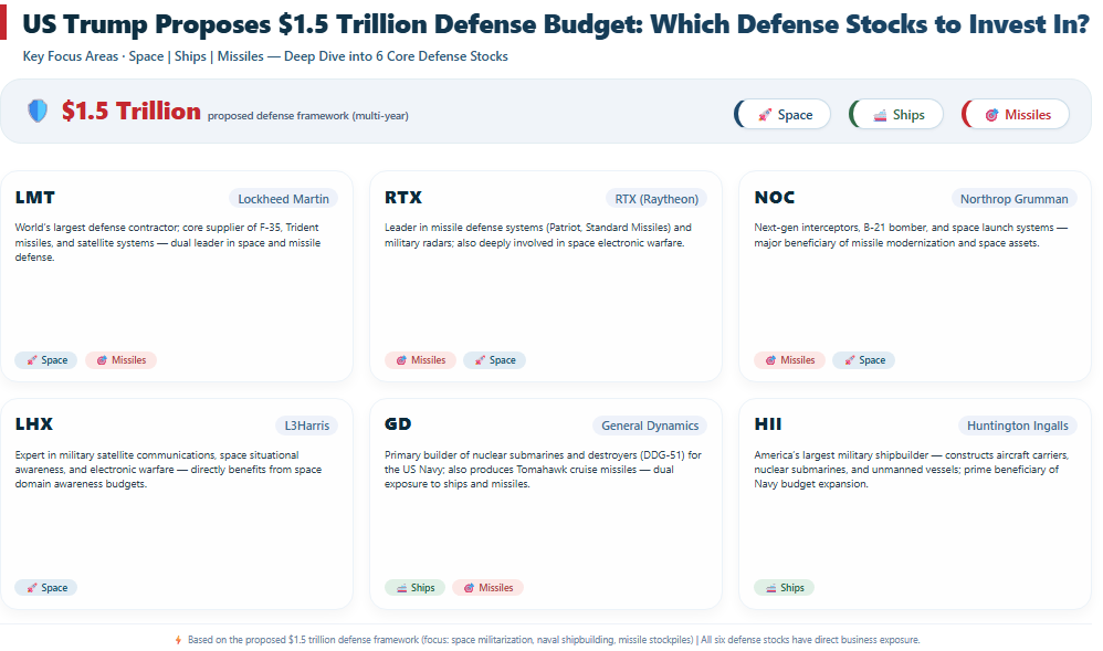 TradingKey - 特朗普近日抛出一份规模高达1.5万亿美元的国防预算方案,重点聚焦于太空防御、舰船建造和导弹体系三大方向。消息一出,市场立刻把它解读为新一轮军工景气周期的信号,相关美股军工和航天公司也随之受到关注。对投资者来说,这不仅是一份预算提案,更像是未来几年美国国防开支方向的一次提前定调。