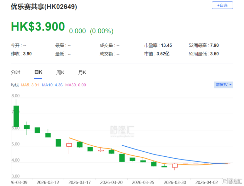从股价来看,优乐赛共享在3月9日港股上市首日跌超43%破发,位居2026年一季度港交所新股首日跌幅榜第二,仅次于铜师傅。如今优乐赛共享的股价已跌至3.9港元/股,累计跌幅超过64%,市值大幅蒸发。