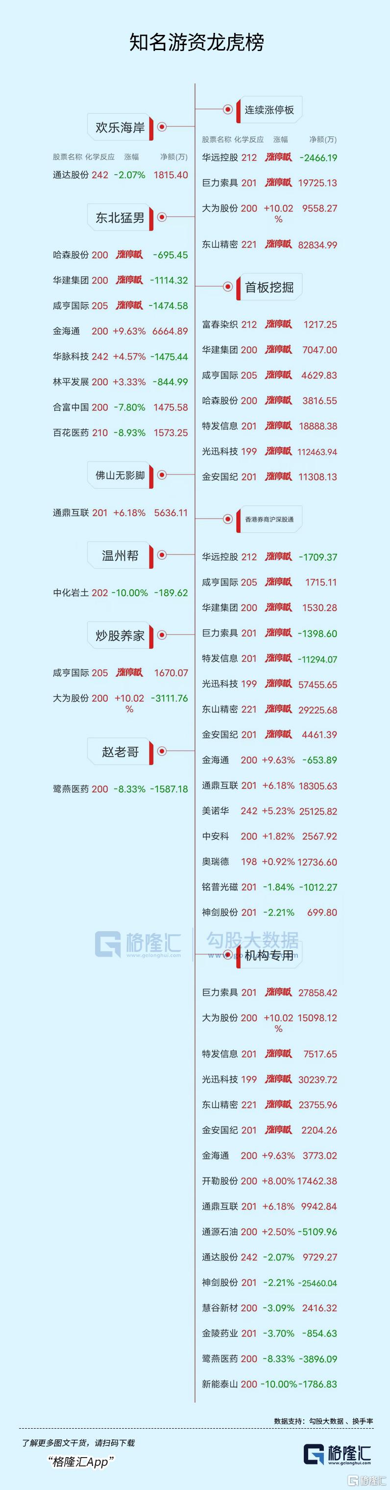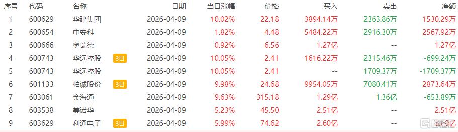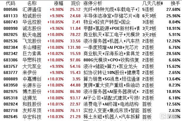 高位股方面,光纤概念股汇源通信5连板,柏诚股份6天3板,华远控股3连板。诚志股份、航天电器3天2板,飞龙股份、东山精密、巨力索具等2连板。