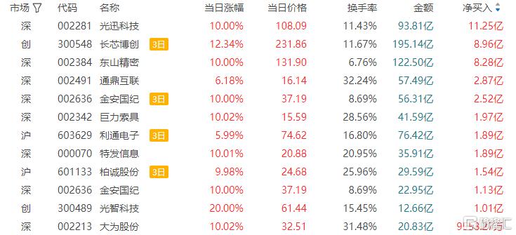 龙虎榜单日净买入额前三为光迅科技、东山精密、通鼎互联,分别为11.25亿元、8.28亿元、2.87亿元。