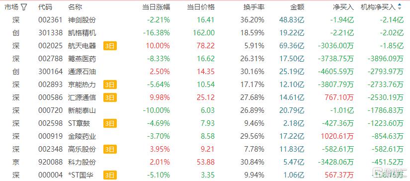 龙虎榜中涉及机构专用席位的个股中,当日净卖出额前三为神剑股份、凯格精机、鹭燕医药,分别为2.14亿元、2.02亿元、3896.09万元。