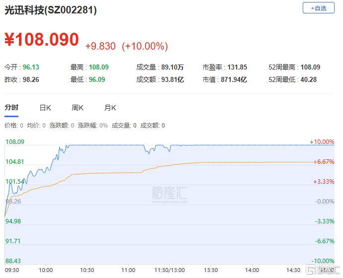光迅科技:今日涨停,全天换手率11.43%,成交额93.81亿元,振幅12.49%。龙虎榜数据显示,机构净买入2.18亿元,深股通净买入5.75亿元,营业部席位合计净买入3.32亿元。