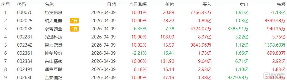 在龙虎榜中,涉及深股通专用席位的个股有10只,光迅科技的深股通专用席位净买入额最大,净买入5.75亿元。