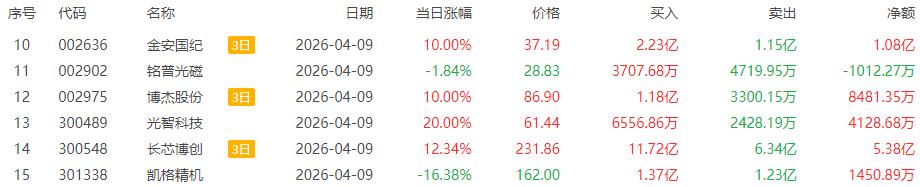 龙虎榜单日净卖出额前三为铭普光磁、凯格精机、神剑股份,分别为3.47亿元、2.21亿元、1.94亿元。