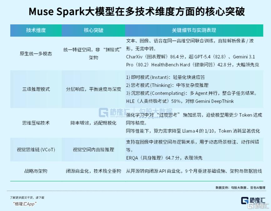 其三,战略定位清晰。作为Muse系列的首款产品,Muse Spark采用完全闭源模式,不公开核心代码与架构,这标志着Meta彻底放弃了“纯开源”的发展路线,转向“闭源核心 API服务 C端落地”的商业化路径。