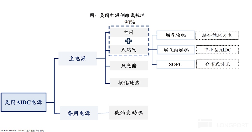 面对电网容量枯竭与极长的接网排期,美国 AIDC 正在加速向 “就地发电/微电网” 架构演进。电源侧整体分为主电源与备用电源两条思路: