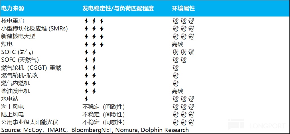 而就地发电的方式主要包括:① 燃气轮机;② 燃料电池;③ 往复式发动机;④ 光伏;⑤ 地热能;⑥ SMRs (小型模块化反应堆) 等,基于上述原则,海豚君对主流就地发电技术路径进行筛选:
