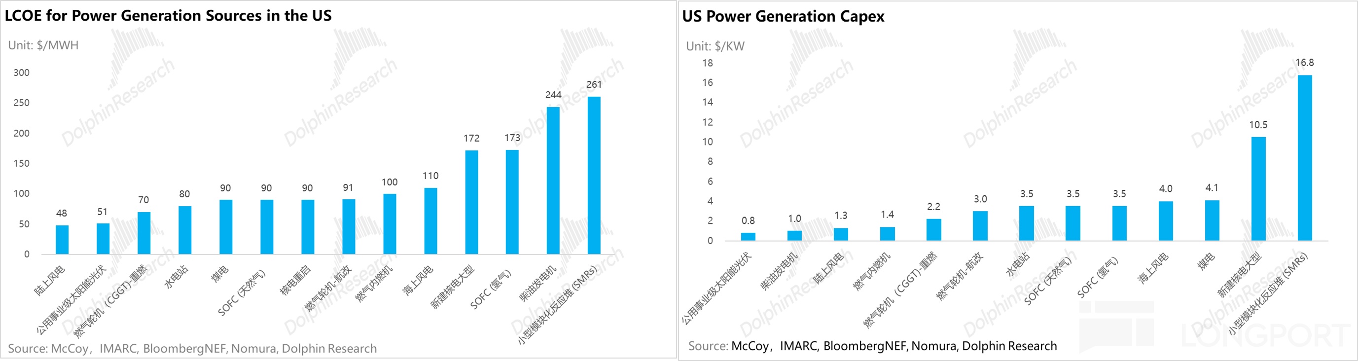 SOFC(天然气燃料电池): LCOE 约 90 美元/MWh。优势在于部署极快(最快 90 天内点亮)、转换效率高、碳排放低;劣势在于初始投资较高(ITC 补贴后约 3.5 美元/W)及处于商业化初期。