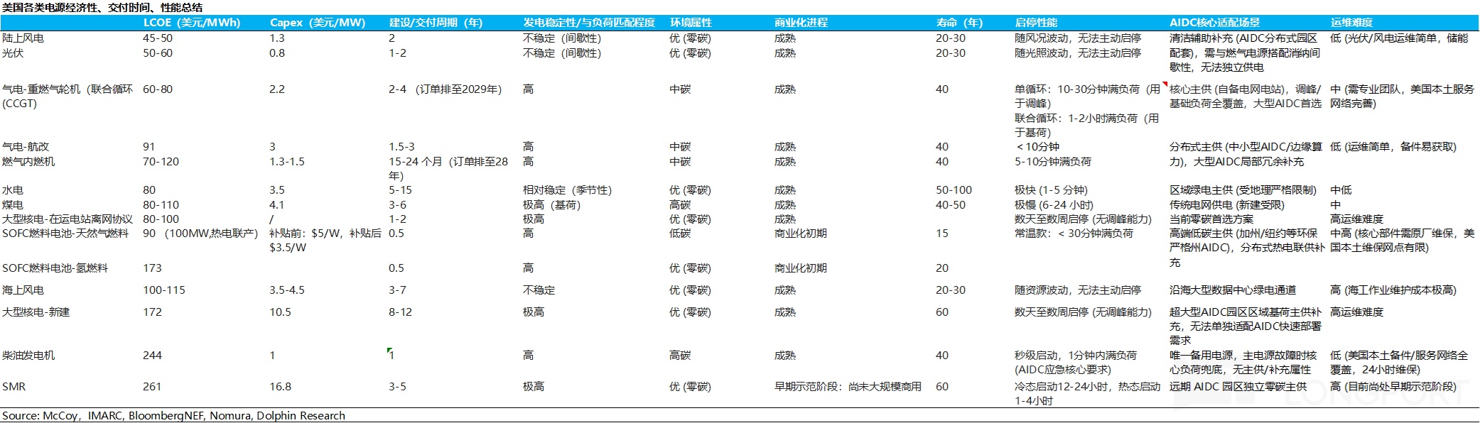 综合供电稳定性、交付速度、全生命周期成本三大维度,海豚君认为燃气轮机、燃气内燃机、SOFC 将成为数据中心自建电源的三大主力形式,并在不同场景下形成互补:
