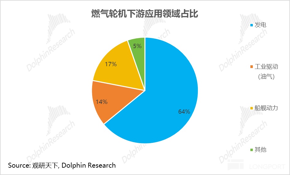 燃气轮机下游应用广泛,主要覆盖发电、工业驱动及舰船动力三大核心领域。其中,发电是绝对主导,贡献了约 64% 的市场需求。