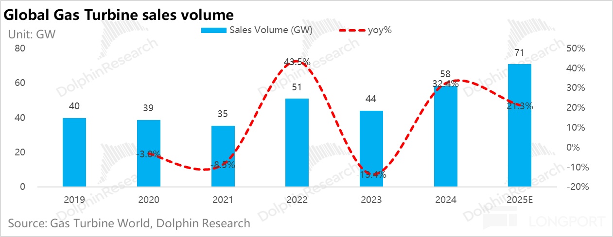 装机规模加速跃升:过去五年(2019-2024),全球燃气轮机新增规模从 40GW 稳步增长至 58.4GW,复合年增长率(CAGR)维持在稳健的 8%。但受下游算力激增催化,预计 2025 年全球新增规模将飙升至 70.84GW,同比增速高达 21%,行业景气度正陡峭向上。