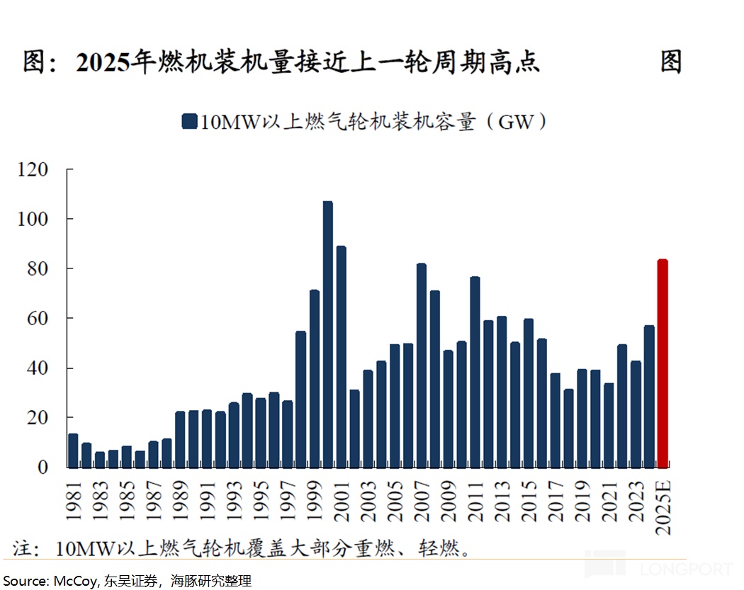 AI 复刻互联网周期: 2025 年全球新增装机正快速逼近上一轮周期的历史最高点。回顾 2001 年,燃机的大繁荣正是由 “互联网爆发” 带来的电力需求激增所驱动(后因气价上涨及建设过热回落)。