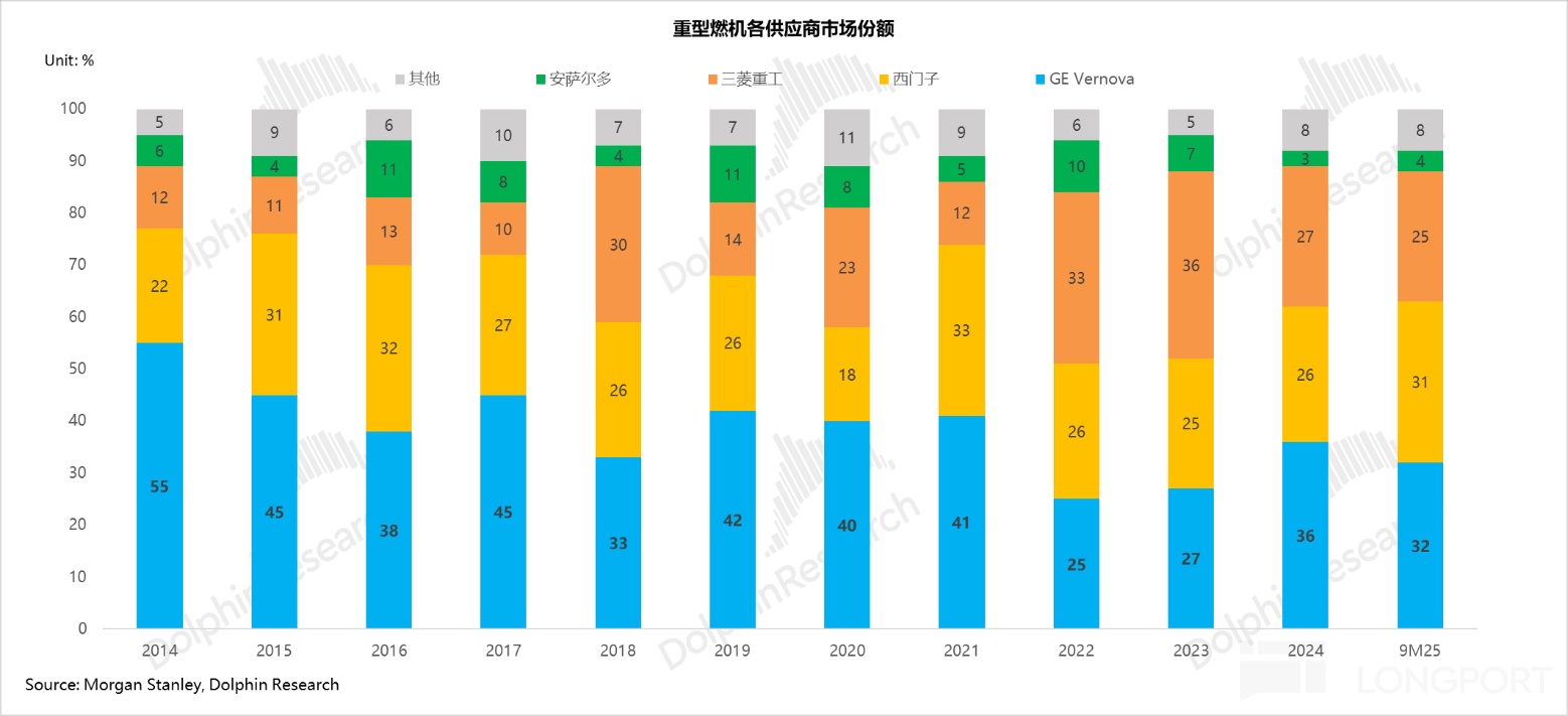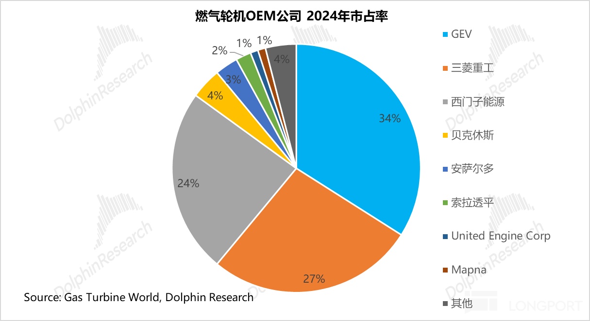 当前,全球重型燃气轮机市场呈现出极其稳固的寡头垄断格局。2024 年,GE Vernova (GEV)、西门子能源与三菱重工三大主机厂合计揽获全球约 85% 的订单份额,在重型燃机领域的市占率更是高达约 90%。
