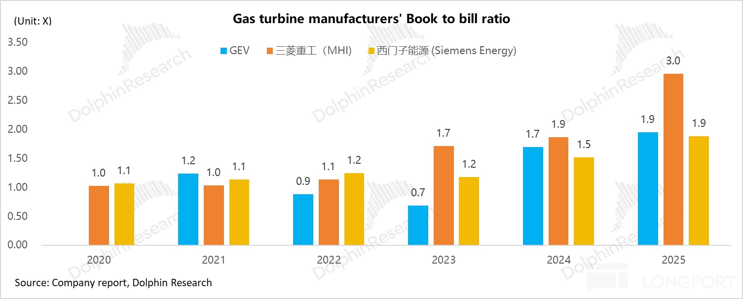 自 2024 年起,三大巨头新签订单量均创下多年乃至历史新高。2025 财年,西门子能源、GEV、三菱重工的订单出货比普遍已升至 2 左右,三菱已经达到 3 年,在手订单持续快速累积。