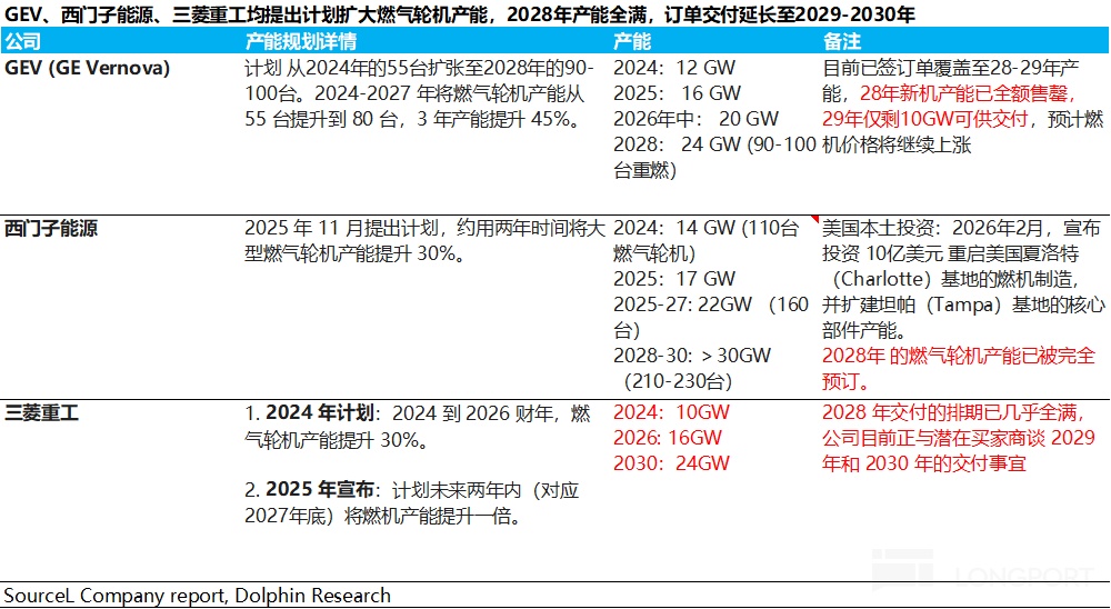 为应对爆发的需求,三巨头均公布了激进的扩产计划(如 GEV 计划至 2028 年产能提升至 24GW,西门子目标 30GW ,三菱计划两年内翻倍)。