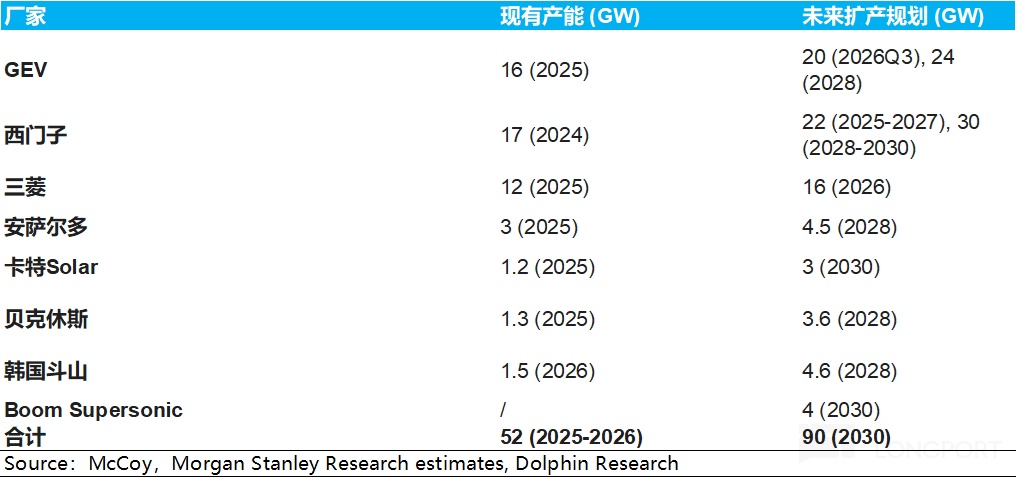 然而,即便算上这些扩产产能,三巨头到 2028 年的产能也已被现有订单基本排满。扩产的实际节奏严重受制于上游核心零部件(特别是涡轮叶片)的产能瓶颈。