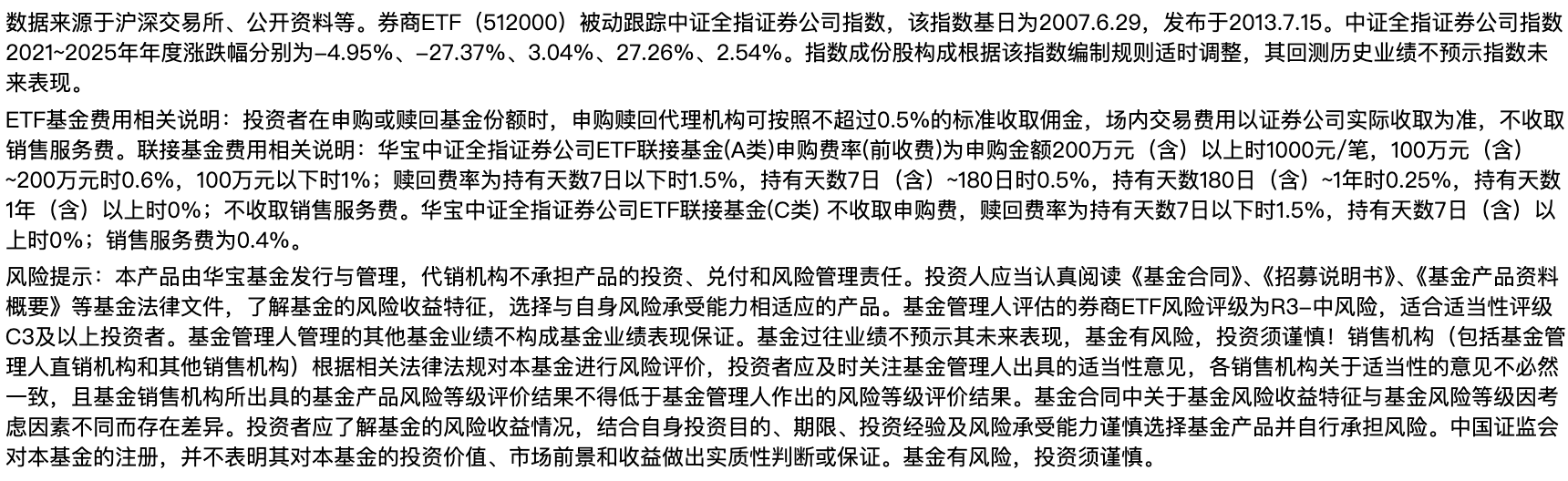 高景气 低估值,关注券商修复行情!券商ETF(512000)及其联接基金(A类 006098、C类007531)被动跟踪中证全指证券公司指数,一键囊括49只上市券商股,是集中布局头部券商、同时兼顾中小券商的高效率投资工具。券商ETF(512000)最新基金规模达355亿元,年内日均成交额超11亿元,为A股规模、流动性居前的顶流券业ETF。