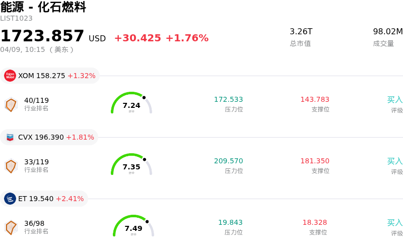 TotalEnergies SE (TTE) 盘中上涨3.23%, 所属行业能源 - 化石燃料上涨1.76% ,公司涨幅跑赢行业涨幅,行业成交额前三股票 埃克森美孚 (XOM) 上涨 1.32%;雪佛龙 (CVX) 上涨 1.81%;Energy Transfer LP (ET) 上涨 2.41%。