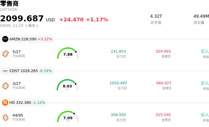 亚马逊 (AMZN) 盘中上涨3.32%, 所属行业零售商上涨1.17% ,公司涨幅跑赢行业涨幅,行业成交额前三股票 亚马逊 (AMZN) 上涨 3.32%;开市客 (COST) 下跌 0.19%;家得宝 (HD) 下跌 1.12%。