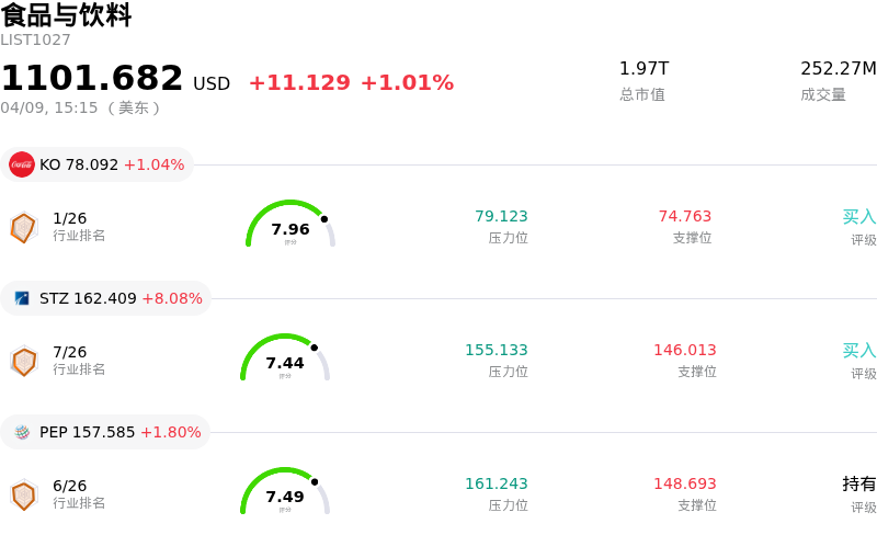 星座品牌 (STZ) 盘中上涨8.08%, 所属行业食品与饮料上涨1.01% ,公司涨幅跑赢行业涨幅,行业成交额前三股票 可口可乐 (KO) 上涨 1.04%;星座品牌 (STZ) 上涨 8.08%;百事 (PEP) 上涨 1.80%。