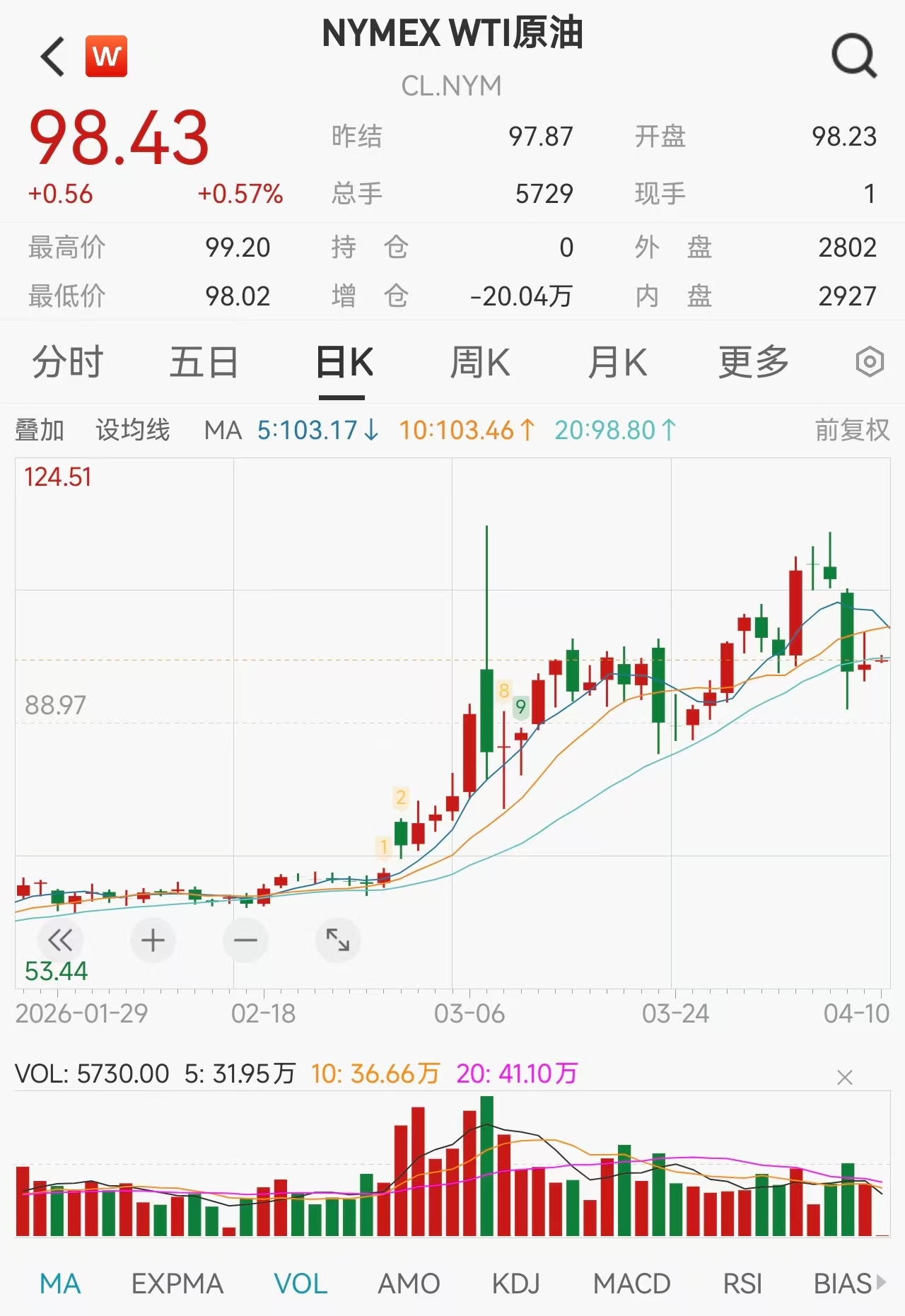这一系列动态直接牵动着大宗商品市场的神经。4月9日,国际油价在盘中剧烈震荡。纽约商品交易所5月交货的轻质原油期货价格一度突破每桶102美元,最终收于每桶97.87美元,涨幅为3.66%。4月10日开盘后,WTI原油期货延续涨势。光大证券分析指出,霍尔木兹海峡关闭导致中东各国产量被迫压缩,考虑到油田长期关闭会永久影响生产能力,即使停火,供应也难以迅速恢复。该机构预计,供应缺口将长期存在,2026年全年布伦特油价中枢看至85美元/桶。