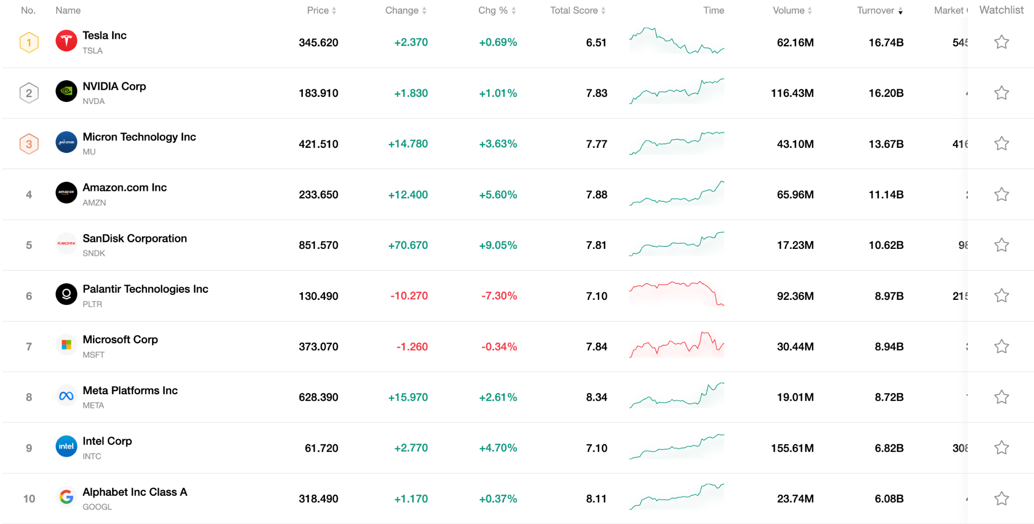 下图列出了当前市场上交易最活跃的十只股票。凭借庞大的成交量和极高的流动性,这些标的已成为追踪全球市场动态的关键基准。