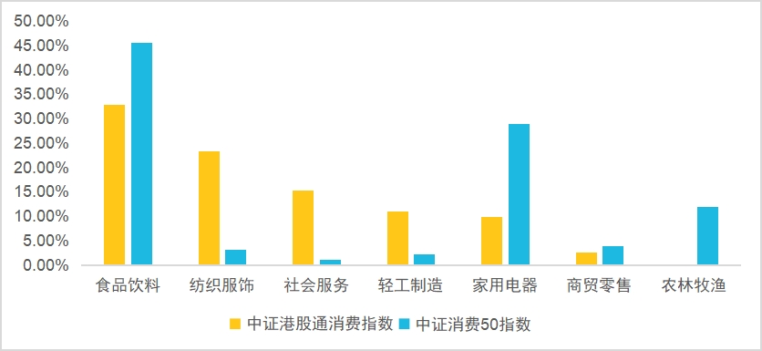 图:中证港股通消费主题指数vs中证消费50指数:行业权重分布对比
