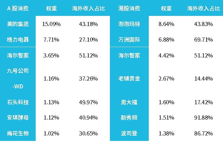 表:高海外收入占比权重股对比(中证消费50指数vs中证港股通消费主题指数)