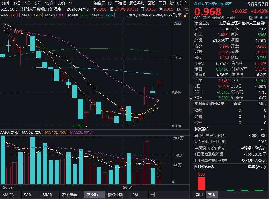 消息面上,美国和伊朗将于4月11日在巴基斯坦举行首轮会谈。昨夜美股芯片股大涨,闪迪涨超9%续创新高!4月10日,A股市场震荡回暖,截至9:53,科创芯片ETF汇添富(588750)涨超2%,冲击五连阳,外部扰动下尽显韧性!科创人工智能ETF汇添富(589560)同样放量涨超2%!