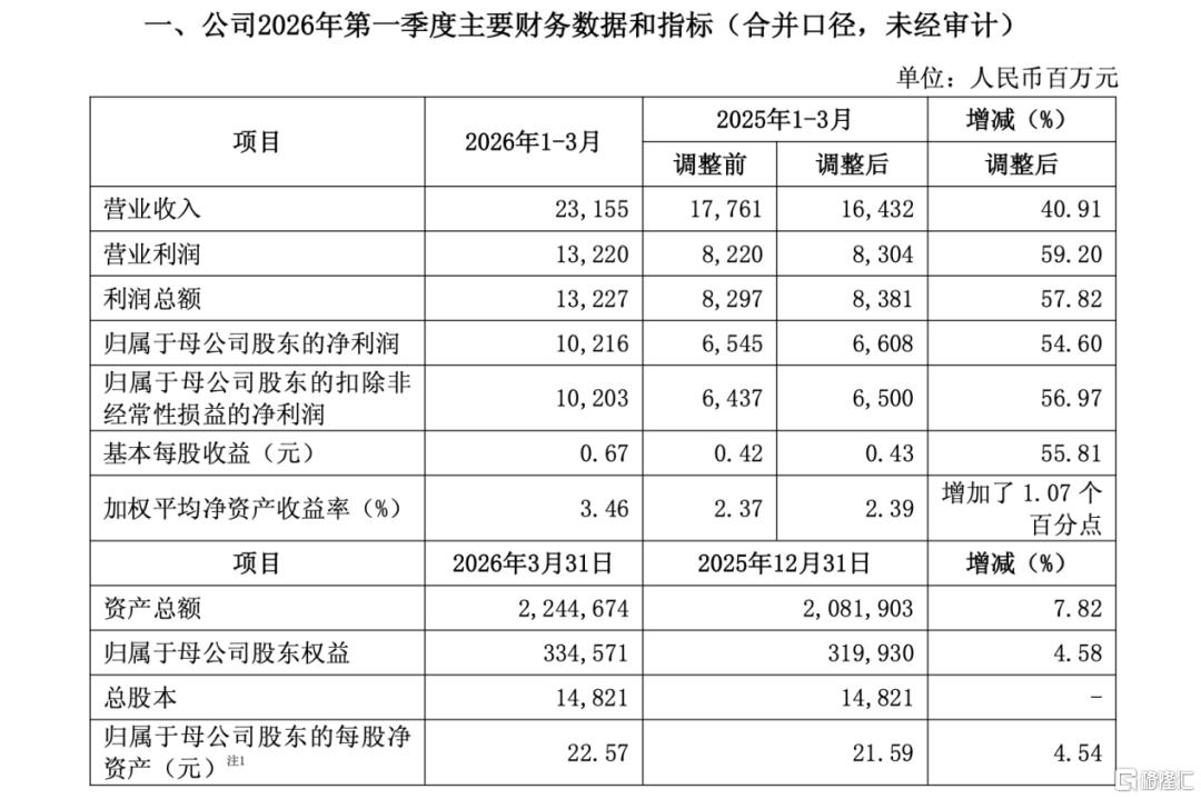 归属于母公司股东的净利润为102.16亿元,同比增加54.6%,创下单季盈利新高。