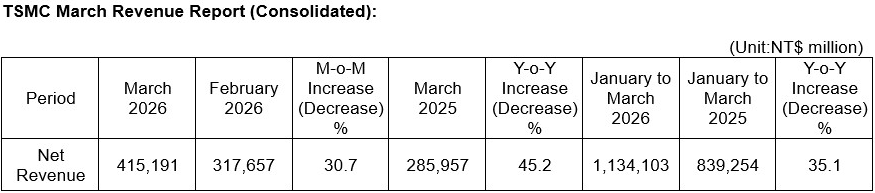 台积电于本周五对外披露的最新营运数据显示,3月单月营收达到4151.9亿新台币,较2月环比大幅攀升30.7%,同比增幅更是达到45.2%,这一同比增速显著高于前几个月的表现。