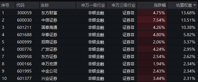 证券ETF汇添富(560090)标的指数成分股全线冲高,中信证券涨超7%,华泰证券、广发证券、东方财富涨超4%,招商证券、申万宏源等涨幅居前。
