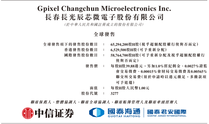 长春长光辰芯微电子股份有限公司(03277.HK)于2026年4月9日正式启动H股招股,发售价定为每股39.88港元,每手100股,入场费约4,028.23港元,预计于2026年4月17日在港交所主板挂牌上市。本次拟全球发售6,529万股,募集资金约25.04亿港元。
