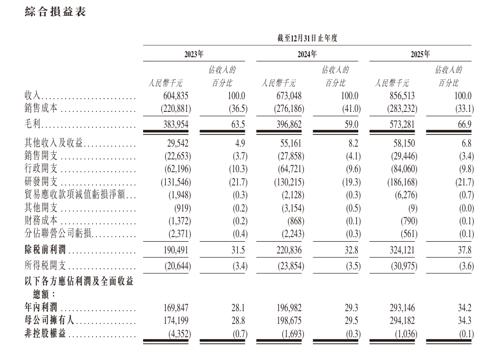 毛利率行业领先,盈利能力强劲:公司2023年至2025年毛利率分别为63.5%、59.0%及66.9%,处于芯片设计行业顶尖水平。净利润从2023年的1.70亿元增长至2024年的1.97亿元(同比增长16.0%),并在2025年达到2.93亿元,同比增长48.7%,利润增速显著快于收入增速,体现了规模效应和经营杠杆的持续释放。净利率从28.1%提升至34.2%,盈利能力持续增强。