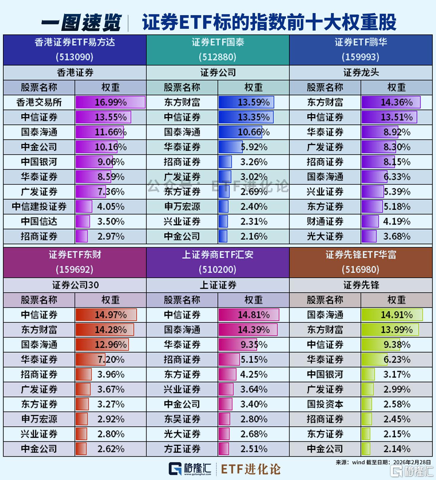 跟踪中证全指证券公司指数的ETF有15只,覆盖A股50家上市券商,聚焦券商行业龙头,也囊括各类特色券商;其中,费率最低的券商ETF银华、证券ETF华夏和证券ETF富国,综合费率0.2%/年;规模最大的证券ETF国泰,最新规模514.88亿元。