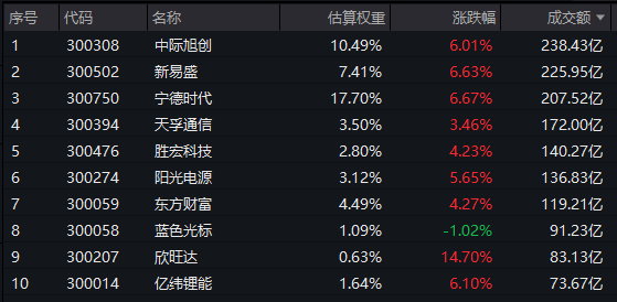 创业板指前十大成份股均为细分赛道龙头企业,合计权重近54%,集中度较高。