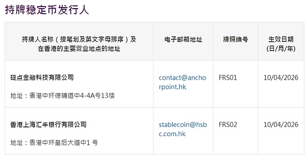 2026年4月10日,香港金融管理局宣布,金融管理专员根据《稳定币条例》向碇点金融科技有限公司及香港上海汇丰银行有限公司授予稳定币发行人牌照,以在香港发行稳定币。