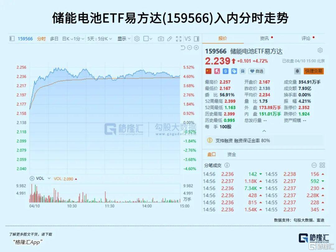 ETF端同样呈现资金涌入态势,电池ETF易方达(159175)大涨4.46%,储能电池ETF易方达(159566)涨超4.72%,近20日资金净流入22.55亿元。