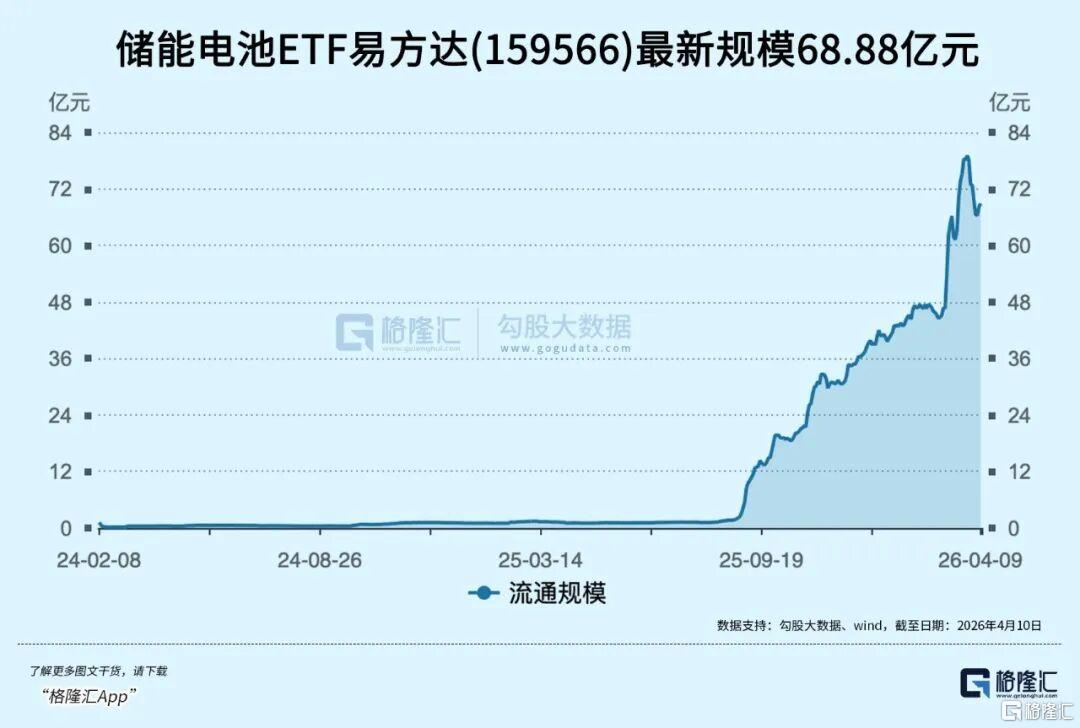 数据显示,储能电池ETF易方达(159566)今日涨4.72%,近3日涨超10%,近20日资金净流入22.55亿元,最新规模68.88亿元。
