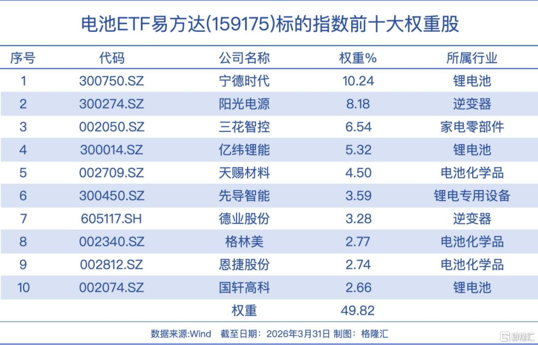 电池ETF易方达(159175)跟踪中证电池主题指数,覆盖动力电池、储能、消费电子电池全产业链,聚焦宁德时代、三花智控、阳光电源等行业龙头,其综合费率0.2%/年,为同类最低。